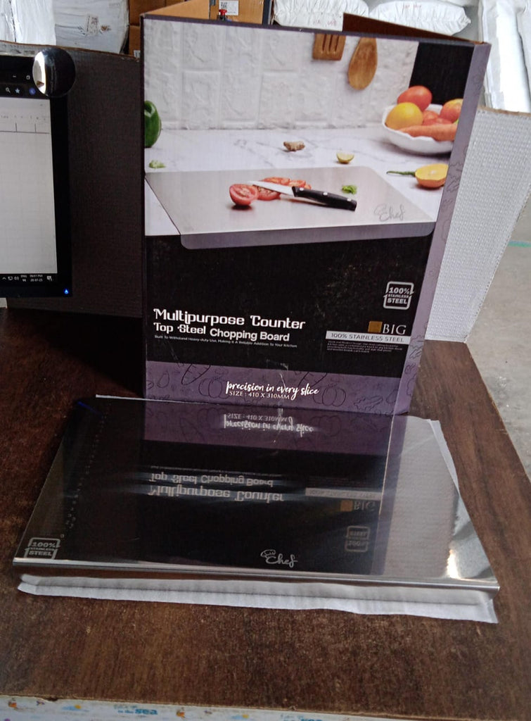Elevate your food preparation experience with this Premium Stainless Steel Chopping Board – a sleek, durable, and hygienic solution for modern kitchens. Unlike traditional wooden or plastic boards that harbour bacteria or wear down over time, this cutting board offers a non-porous, rustproof surface that’s exceptionally resistant to stains, odours, and scratches. Its bent-edge design provides added stability on the countertop, while the brushed finish enhances the aesthetic appeal and makes cleaning effortless.